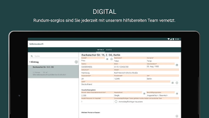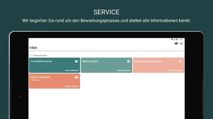 一旦您决定深入探索,talyo.wohnen App 将为您提供一套强大的个性化工具。您可以保存心仪的房源,并享受便捷流畅的在线申请流程。预约实地看房从未如此简单,只需轻点几下即可安排。此外,应用支持数字化填写各类表单,并赋予您数据与文件的自主管理权限。无论是租赁合同相关文件的上传与下载,还是对您的所有个人数据进行全面概览,一切尽在您的掌控之中。